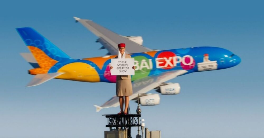 សារដែលនារីរូបនេះ រួមនឹងក្រុមអ្នកបើកបរយន្តហោះ Emirates A៣៨០ ផ្ញើជូនពិភពលោក នោះគឺ៖ «សូមហោះហើរជាមួយយន្តហោះ Emirates A៣៨០ ដើម្បីទៅចូលរួមព្រឹត្តិការណ៍ Dubai Expo ២០២០ ដែលជាពិធីតាំងពិព័រណ៍អន្តរជាតិធំបំផុតក្នុងពិភពលោក»។