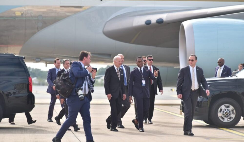 យន្តហោះដឹកប្រធានាធិបតីអាម៉េរិក លោក ចូ បៃដិន ចុះចតនៅឯ អាកាសយានដ្ឋានអន្តរជាតិភ្នំពេញ នាថ្ងៃនេះ នៅពេលលោកត្រៀមចូលរួមកិច្ចប្រជុំកំពូលអាស៊ាន ជាមួយនឹងដៃគូសហការ។