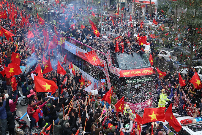 អ្នកគាំទ្ររាប់ពាន់នាក់ បានប្រមូលផ្តុំគ្នាតាមដងវិថីនានាតាំងពីព្រលានយន្តហោះ Noi Bai រហូតដល់កណ្តាលទីក្រុងហាណូយ ដើម្បីស្វាគមន៍រថយន្តក្រុងរបស់ក្រុមវីរបុរស។