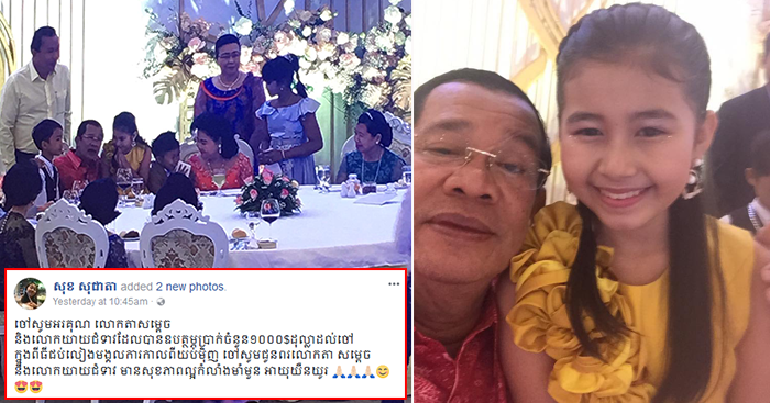 នាងតូចជាម្ចាស់បទ “ផ្កា” រូបនេះបានបង្ហោះសារនៅលើហ្វេសប៊ុកផ្ទាល់ថា «ចៅសូមអរគុណ លោកតាសម្ដេច និងលោកយាយជំទាវដែលបានឧបត្ថម្ភប្រាក់ចំនួន1,000ដុល្លារដល់ចៅ ក្នុងពីធីជប់លៀងមង្គលការកាលពីយប់មិញ ចៅសូមជូនពរលោកតាសម្ដេច និងលោកយាយជំទាវ មានសុខភាពល្អ កម្លាំងមាំមួន អាយុយឺនយូរ»៕