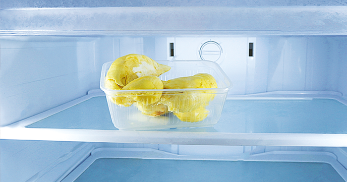 បងៗស្រីមេផ្ទះគ្រាន់តែពុះផ្លែក្រូចឆ្មារ ឬក្រូចលេម៉ុនជាបន្ទះៗ យកទៅដាក់ក្នុងទូទឹកកក តែប៉ុណ្ណឹងបន្ទះក្រូចឆ្មារក៏នឹងជួយបឺតយកក្លិនខ្លាំងៗរបស់ទុរេនចេញអស់ទៅហើយ។