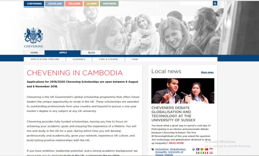 អាហារូបករណ៍ Chevening សម្រាប់ឆ្នាំសិក្សា 2019-2020 បានបើកឱ្យដាក់ពាក្យជាថ្មីម្តងទៀតហើយចាប់ពីថ្ងៃទី6 ខែសីហា ដល់ថ្ងៃទី6 ខែវិច្ឆិកា ឆ្នាំ2018នេះ។