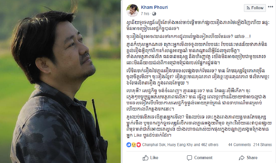លោក ខាំ ភូរិ បានសរសេរសារនៅលើបណ្ដាញសង្គមហ្វេសប៊ុក ដោយបង្ហាញពីក្ដីបារម្ភ និងកង្វល់យ៉ាងច្រើនចំពោះរឿងភាគខ្មែរថា «ស្ថានីយទូរទស្សន៍ស្ទើរតែទាំងអស់ចាប់ផ្តើមចាក់ផ្សាយរឿងភាគថៃឡើងវិញហើយ ឆន្ទៈមិនអាចប្រៀបសេដ្ឋកិច្ចបានទេ។ ចុះរឿងខ្មែរអាចឈានទៅរកការដួលរលំម្តងទៀតហើយមែនទេ? នៅទេ! គ្មានកំហុសអ្នកណាទេ ព្រោះអ្នកមើលទទួលយកបែបនេះ បែបនេះមានន័យថា គាត់មិនខ្វល់រឿងអ្វីក្រៅពីការកម្សាន្តអារម្មណ៍ មានតណ្ហាលើអ្វីដែលចូលចិត្ត។ ទាំងសមត្ថភាពផលិត ធនធានមនុស្ស និងហិរញ្ញវត្ថុ យើងមិនអាចប្រៀបជាមួយគេទេ នោះមិននិយាយដល់ពីការជ្រោមជ្រែងរបស់ផ្នែករដ្ឋផង»។
