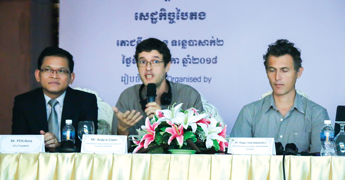 លោក Andeol Cadin ប្រធានគណៈកម្មាធិការធុរកិច្ចបៃតងនៃសភាពាណិជ្ជកម្មអឺរ៉ុបមានប្រសាសន៍ថា ផ្អែកលើបទពិ-សោធដែលធ្លាប់ឆ្លងកាត់នៅក្នុងប្រទេសអភិវឌ្ឍន៍មួយចំនួន ពិសេសប្រទេសក្នុងសហគមន៍អឺរ៉ុបផ្ទាល់ឃើញថា ការប្រកួតប្រជែងពាណិជ្ជកម្មដែលមិនគិតគូរអំពីបរិស្ថាន បានធ្វើឱ្យមានផលប៉ះពាល់ដល់សុខភាពប្រជាជនជាខ្លាំង ដូច្នេះដើម្បីលើកកម្ពស់សុខភាពនិយោជិត និងប្រជាជនក្នុងប្រទេសកម្ពុជាលោកអំពាវនាវឱ្យម្ចាស់សហគ្រាស ក្រុមហ៊ុនឯកជន និងរដ្ឋាភិបាលគួរសហការគ្នាចូលរួមអភិវឌ្ឍប្រទេសតាមបែបសេដ្ឋកិច្ចបៃតង។