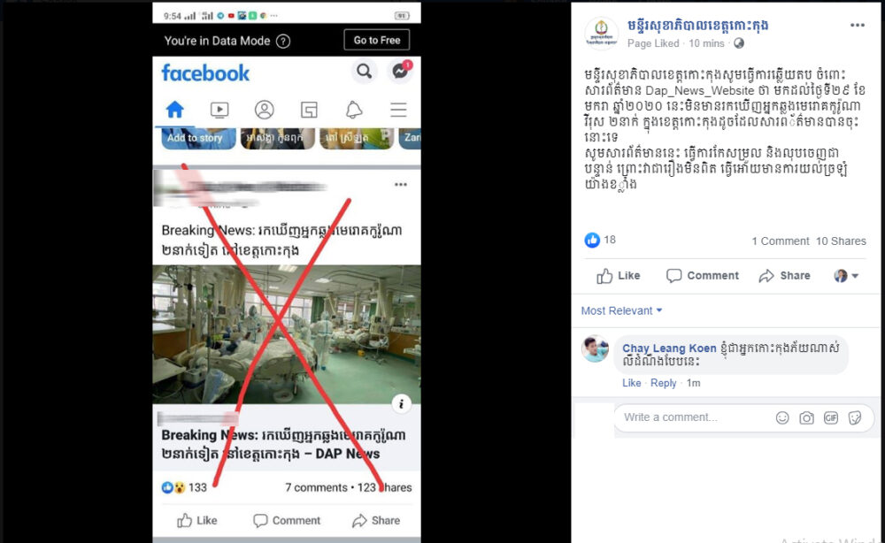 មន្ទីរសុខាភិបាលខេត្តកោះកុងកាលពីពេលថ្មីៗនេះបានចេញសេចក្តីប្រកាសលើទំព័រ Facebook ផ្លូវការរបស់ខ្លួនថាការផ្សាយព័ត៌មានថា «រកឃើញអ្នកឆ្លងមេរោគកូរ៉ូណា2នាក់ទៀត នៅខេត្តកោះកុង» ជាព័ត៌មានមិនពិត។