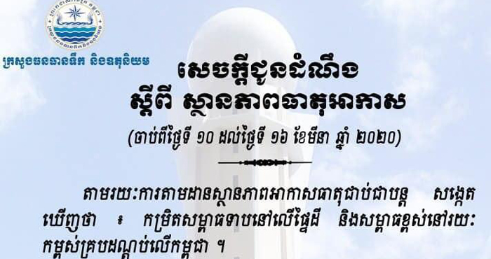 ក្រសួងធនធានទឹក និងឧតុនិយម នៅថ្ងៃទី១០ ខែមីនា ឆ្នាំ២០២០នេះ បានចេញសេចក្តីជូនដំណឹងថ្មីមួយ ស្តីពីស្ថានភាពធាតុអាកាសនៅកម្ពុជា ចាប់ពីថ្ងៃនេះដល់ថ្ងៃទី១៦ ខែមីនា ឆ្នាំ២០២០។