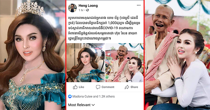 សារទាំងស្រុងរបស់លោក ហេង ឡុង បានសរសេរបង្ហោះថា«សូមគោរពអរគុណដល់អ្នកនាង ចោមច័ន្ទ (បងស្រី ដេននីក្វាន់) ដែលបានបរិច្ចាគទឹកប្រាក់ 1,000ដុល្លារ ដើម្បីចូលរួមទប់ស្កាត់ការរីករាលដាលជំងឺCOVID-19 តបតាមការអំពាវនាវដ៏ខ្ពង់ខ្ពស់របស់សម្ដេចតេជោ ហ៊ុន សែន នាយករដ្ឋមន្ត្រីនៃព្រះរាជាណាចក្រកម្ពុជា»។