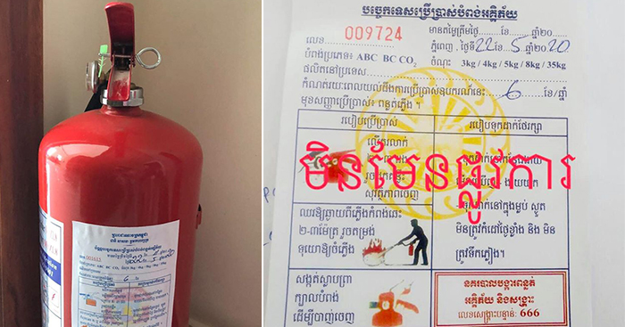 ចំពោះលិខិតបញ្ជាក់ ឬបណ្ណ ដូចបានបង្ហាញជូនខាងក្រោមនេះគឺអនុវត្តផ្ទុយ ប្រកាសរបស់ ក្រសួងមហាផ្ទៃលេខ6380 ប្រ.ក (ស្តីពីការប្រគល់សិទ្ទិត្រួតពិនិត្យសំណង់និងគោលដៅដែលតម្រូវអោយមានប្លង់ប្រពន្ធ័បង្ការ និងពន្លត់អគ្គីភ័យចុះថ្ងៃ ទី17ខែកក្កដាឆ្នាំ2019)។ និងសេចក្តីណែនាំលេខ012 ស.ណ.ន របស់អគ្គស្នងការនគរបាលជាតិ ស្តីពីការចេញលិខិត ឬបណ្ណត្រួតពិនិត្យអំពីគុណភាពប្រសិទ្ធិភាពលើឧបករណ៏ សម្ភារ បរិក្ខា បង្ការពន្លត់អគ្គីភ័យនិងការបញ្ជាក់ទទួល ស្គាល់លើប្រពន្ធ័សុវត្ថិភាពបង្ការពន្លត់អគ្គីភ័យតាមគោលដៅ៕