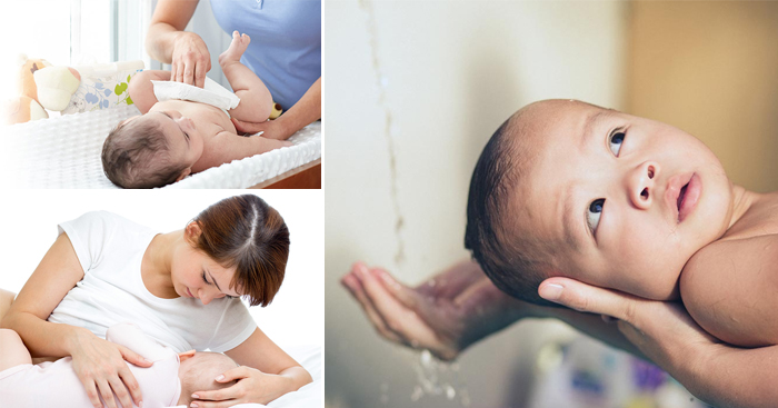 . ផ្ងូតទឹកឲ្យកូនតូច : គួរងូតទឹកឲ្យកូនតូចក្នុងមួយថ្ងៃ 2 ដង ព្រឹក-ល្ងាច (ព្រឹកអាចនៅពេលថ្ងៃបន្តិច និងល្ងាចមុនពេលព្រលប់) ដោយត្រៀមឧបករណ៍សម្រាប់ងូតទឹកដូចជា សាប៊ូដុសខ្លួន សាប៊ូកក់សក់ អេប៉ុងដុសខ្លួន កន្សែងជូតខ្លួន និងចានដែកងូតទឹកដែលមានបន្ទះការពាររអឹល ។ ត្រៀមទឹកនៅក្នុងចានដែកឲ្យមានសីតុណ្ហភាពសមល្មម មិនត្រជាក់ពេក ឬក្តៅពេក បន្ទាប់មកទើបក្បង់ទឹកមកលាបលើខ្លួនកូនថ្នមៗ ដើម្បីឲ្យកូនបានសម្រួលខ្លួនជាមុនសិន រួចហើយទើបកក់សក់កូនតូចមុនគេបង្អស់ ។ សម្រាប់ការផ្ងូតទឹកសម្អាតខ្លួនឲ្យកូនតូចនេះ ចូរសង្កត់ធ្ងន់លើការសម្អាតតាមចំណុចគន្លាក់ផ្សេងៗ ជាពិសេស គល់ភ្លៅ គន្លាក់ក្បាលជង្គង់ ក្លៀក និងរន្ធគូទជាដើម ។ ចំពោះការផ្ងូតទឹកឲ្យកូនតូចនេះ បើអ្នកម្តាយថ្មីថ្មោងណាមិនសូវជឿជាក់លើខ្លួនឯងនោះ អាចប្រើវិធីងូតទឹកដោយការដាក់កូនឲ្យគេងនៅលើក្រណាត់កៅស៊ូ ហើយយកអេប៉ុងសើមៗមកជូតសម្អាតខ្លួនកូនតូចក៏បានដែរ ។