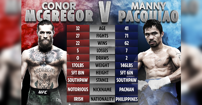 គួរបញ្ជាក់ដែរថា McGregor និង Pacquiao សុទ្ធតែជាកីឡាករដែលធ្លាប់ឡើងសង្វៀនប្រដាល់សកលជាមួយ Floyd ម្ដងម្នាក់រួចមកហើយ។ ដោយកាលនោះ រូបគេទាំង2 សុទ្ធតែបរាជ័យទាំងអស់ ប៉ុន្តែទទួលបានតម្លៃខ្លួនយ៉ាងច្រើន៕