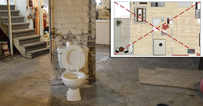 បន្ទប់ទឹក និងបង្គន់ បើស្ថិតនៅក្នុងទីតាំងជាន់លើ ចំកណ្ដាលផ្ទះ គឺជាទីតាំងអពមង្គលបំផុត ព្រោះនឹងហុចផលអាក្រក់ខាងលុយកាក់ និងសុខភាពរបស់អ្នកស្នាក់អាស្រ័យក្នុងអគារ ឬផ្ទះមួយខ្នងនោះ ដោយសារសមាជិកក្នុងផ្ទះគ្រប់គ្នាត្រូវដើរមុជក្រោមបន្ទប់ទឹក និងបង្គន់ជារៀងរាល់ថ្ងៃ ហើយអ្នកជំនាញខាងហុងស៊ុយបានបញ្ជាក់យ៉ាងច្បាស់ថា បន្ទប់ទឹកគឺជាទីកន្លែងដែលត្រូវបញ្ចេញភាពអពមង្គល បញ្ចេញកាកសំណល់ចោល ដូច្នេះទើបមនុស្សកាលពីសម័យមុនច្រើនរៀបចំ និងកំណត់ទីតាំងរបស់បន្ទប់ទឹក និងបង្គន់ឱ្យនៅឆ្ងាយពីអគារផ្ទះ។