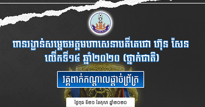 ពានរង្វាន់សម្តេចអគ្គមហាសេនាបតីតេជោ ហ៊ុន សែន លើកទី14 ឆ្នាំ2020 (ថ្នាក់ជាតិ) វគ្គពាក់កណ្តាលផ្តាច់ព្រ័ត្រ នឹងធ្វើឡើងនៅថ្ងៃពុធ ទី21 ខែតុលា ឆ្នាំ2020 និងថ្ងៃព្រហស្បតិ៍ ទី22 ខែតុលា ឆ្នាំ2020 នៅពហុកីឡដ្ឋានជាតិ ចាប់ពីម៉ោង 6ល្ងាចតទៅ។