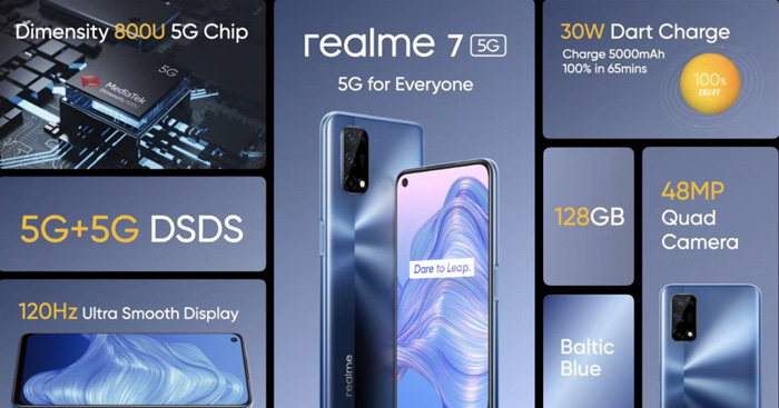 ខាងក្រោមនេះជា លក្ខណសម្បត្តិដែលមានលើ realme 7 5G ៖ វាមានបំពាក់មកជាមួយ នូវអេក្រង់ទំហំ 6.5 អ៊ីញ ជាប្រភេទ IPS LCD ក្នុងកម្រិតបង្ហាញរូបភាព FHD+ ជាមួយល្បឿន Refresh Rate អេក្រង់កម្រិត 120Hz។ ផ្នែកខាងមុខរចនាប័ទ្ម អេក្រង់បែបទម្លុះ ដាក់កាមេរ៉ាមុខចំនួន 1គ្រាប់ ដូចទៅនឹង realme 7ដែរ។ ប្រើប្រាស់បន្ទះឈីប Dimensity 800U របស់ក្រុមហ៊ុន MediaTek មានជម្រើស RAM 8GB មេម៉ូរី 128GB និងអាចបន្ថែម MicroSD Card បាន។