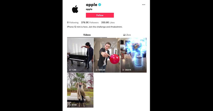 អ្នកទាំងអស់គ្នាបានដឹងរួចមកហើយថា Apple បានបង្កើតគណនី TikTok ជាផ្លូវការ លើកដំបូងតាំងពីជាង 6ខែមុន ហើយពេលនេះក្រុមហ៊ុនបានបង្ហោះវីដេអូ ជាលើកដំបូង ដោយមានវត្តមានបុគ្គលល្បីៗនៅលើ TikTok មួយចំនួន ដែលចេញមកផ្សព្វផ្សាយអំពី iPhone 12 mini។ ប្រការដ៏ចម្លែកនេះ គឺជាលើកដំបូងហើយ ដែលក្រុមហ៊ុន Apple យកបណ្ដាញសង្គម មកផ្សព្វផ្សាយផលិតផលរបស់ខ្លួន ទាំងដែលកន្លងមក មិនដែលធ្វើបែបនេះឡើយ តែម្ដងនេះក៏ដូចសព្វដងនៅលើ YouTubeដែរ ពោលគឺ Apple មិនបានបើកការអនុញ្ញាត សម្រាប់ឱ្យអ្នកទស្សនា ធ្វើការបញ្ចេញមតិឡើយ ដោយអាចធ្វើបាន ត្រឹមតែចុច Like និងទស្សនាវីដេអូប៉ុណ្ណោះ។