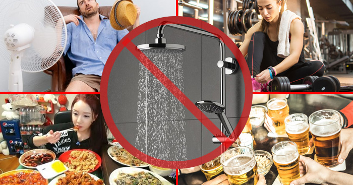 រឹតតែអាកាសធាតុក្ដៅខ្លាំង រឹតតែធ្វើឱ្យយើងចង់តែនៅក្នុងទីកន្លែងត្រជាក់ៗ តែបើសិនជាមានញើសចេញពេញមួយថ្ងៃហើយនោះ ប្រហែលជាគ្មានអ្វីដែលធ្វើឱ្យយើងមានអារម្មណ៍ស្រស់ថ្លាជាងការបានងូតទឹកឡើយ តែក៏មានពេលខ្លះដែលយើងអាចនឹងត្រូវរង់ចាំសិនដែរ ទោះជាក្ដៅបែកញើសស្អិតខ្លួនប៉ុនណាក៏ដោយ ព្រោះអាចនឹងកើតផលអាក្រក់ដល់រាងកាយបាន។