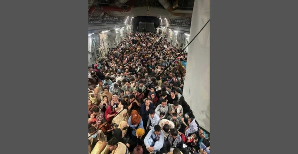 មនុស្សប្រហែល 640 នាក់ អង្គុយស្ទើរតែលើគ្នានៅក្នុងបន្ទប់ដាក់ទំនិញរបស់យន្តហោះ អាមេរិក C-17 ដែលកំពុងជម្លៀសមនុស្សចេញពីប្រទេសអាហ្វហ្គានីស្ថាន នៅពេលក្រុម តាលីបង់ ចូលកាន់កាប់រដ្ឋធានីកាប៊ុល។