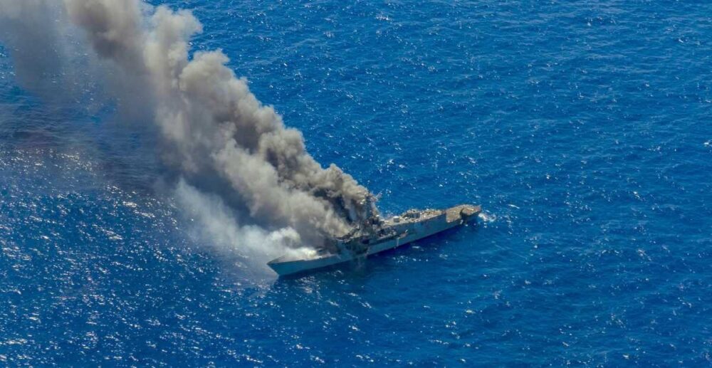 នាវាអមការពារ USS Ingraham បានផ្ទុះឆេះ បង្កើតបានជាអណ្ដាតភ្លើង និងផ្សែងហុយទ្រលោម បន្ទាប់ពីត្រូវរងការវាយប្រហារជាច្រើនគ្រាប់។ កងទ័ពជើងទឹក អាមេរិក មិនបានឱ្យដឹងថា នាវា USS Ingraham បានលិចបែបណានោះទេ។