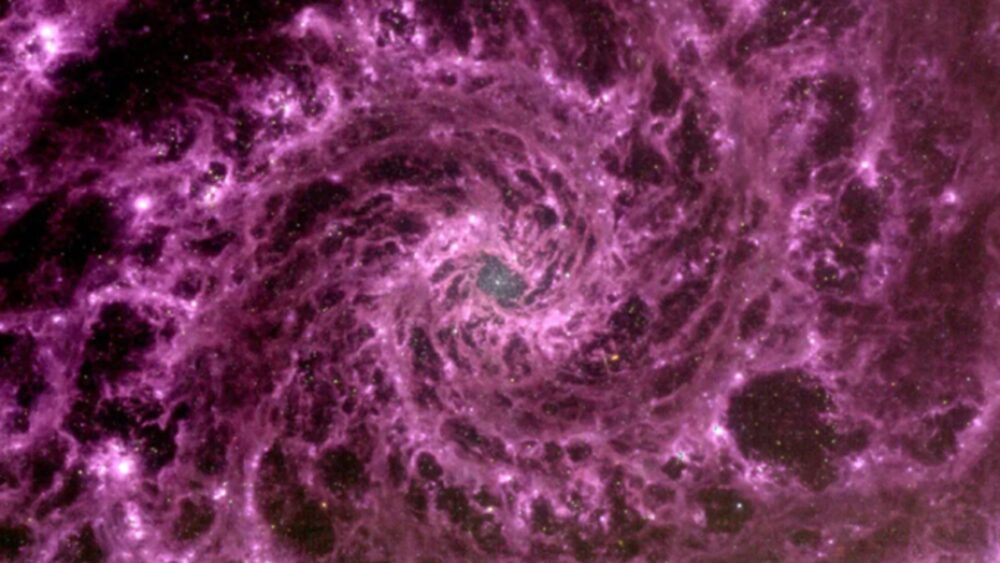រូបភាពដែលបានមកពីទិន្នន័យនៃការសង្កេតថ្មីរបស់តេឡេស្កុបអវកាស James Webb បង្ហាញថា កាឡាក់ស៊ី Messier 74 មានរូបរាងដូចទៅនឹងកំណួចទឹកដ៏មហាប្រល័យ។