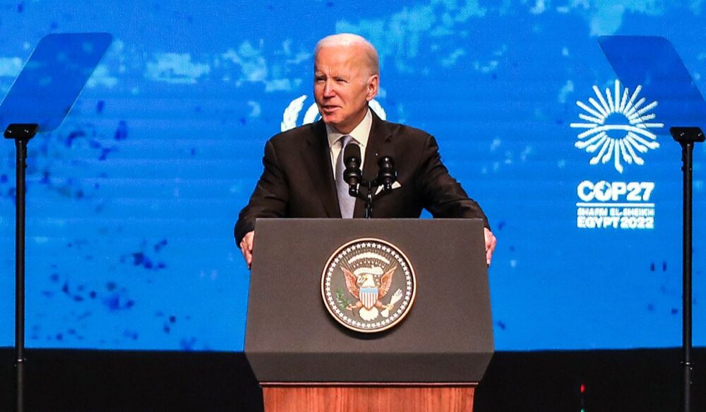 «វិបត្តិអាកាសធាតុគឺជាបញ្ហាសន្តិសុខរបស់មនុស្សជាតិ សន្តិសុខសេដ្ឋកិច្ច សន្តិសុខបរិស្ថាន សន្តិសុខជាតិ និងជារឿងស្លាប់រស់របស់ពិភពផែនដី» ប្រធានាធិបតីអាម៉េរិក លោក បៃដិន ថ្លែងកាលពីថ្ងៃទី 11 វិច្ឆិកា នៅក្នុងសន្និសីទស្ដីពីបម្រែបម្រួលអាកាសធាតុ របស់ អង្គការសហប្រជាជាតិ ឆ្នាំ 2022 (COP29) នៅទីក្រុង Sharm el-Sheikh នៃ ប្រទេសអេហ្ស៊ីប។