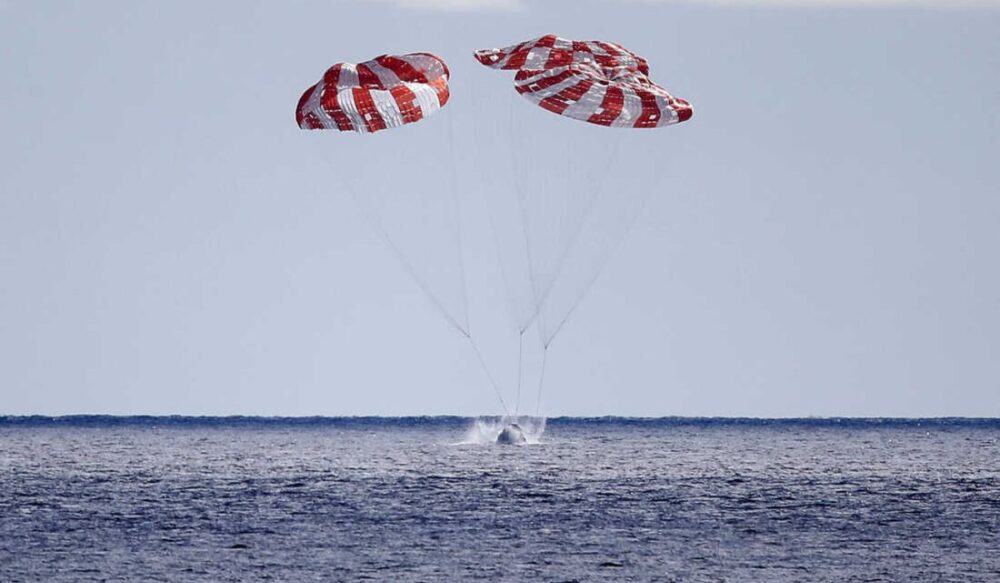 យានអវកាស Orion សម្រេចបានដំណាក់កាលចុងក្រោយនៃដំណើរហោះហើរជាង 385,000 គីឡូម៉ែត្រ ពីព្រះចន្ទត្រលប់មកកាន់ផែនដី។ យានអវកាសនេះបានចុះចតលើផ្ទៃទឹកនៃមហាសមុទ្រប៉ាស៊ីហ្វិក ក្នុងលំហសមុទ្រ Baja California របស់ ម៉ិកស៊ិក កាលពីម៉ោង 12 និង 40 នាទី ថ្ងៃទី 11 ធ្នូ 2022 ត្រូវនឹងម៉ោង 00 និង 40 នាទី ថ្ងៃទី 12 ធ្នូ 2022 នៅ កម្ពុជា។