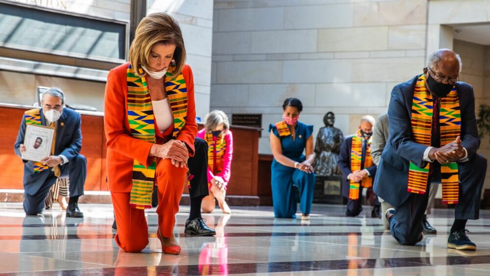 លោកស្រី Pelosi រួមជាមួយនឹងក្រុមមេដឹកនាំកំពូលរបស់បក្សប្រជាធិបតេយ្យនៅរដ្ឋសភា បាននាំគ្នាលុតជង្គង់ និងគោរពវិញ្ញាណក្ខន្ធរយៈពេល8នាទីនិង46វិនាទី ដែលនេះស្មើនឹងរយៈពេលដែលប៉ូលិស Derek Chauvin យកជង្គង់សង្កត់ក George Floyd កាលពីថ្ងៃទី25ឧសភា។ ប្រធានគណៈកម្មធិការយុត្តធម៌នៅសភាជាន់ទាប លោក Jerry Nadler មិនបានលុងជង្គង់ព្រោះបញ្ហាសុខភាព។
