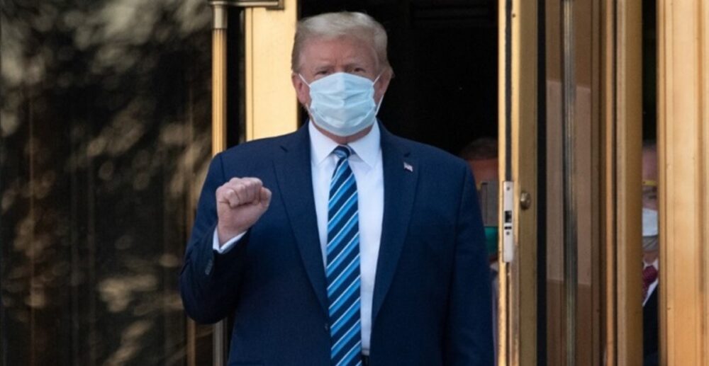 លោក Donald Trump បានចាកចេញពីមន្ទីរពេទ្យយោធា Walter Reed នៅវេលាម៉ោង18និង38នាទី ថ្ងៃទី5តុលា (ម៉ោង5និង38នាទី ថ្ងៃទី6តុលារ នៅភ្នំពេញ)។ ក្រុមអង្គរក្សដែលនៅក្បែរលោក សុទ្ធតែពាក់ម៉ាស់។ ក្រុមអ្នកសារព័ត៌មានបានសួរសំណួរទៅកាន់លោក Trump ប៉ុន្តែ លោកមិនបានឆ្លើយតប់នោះទេ ដោយគ្រាន់តែនិយាយពាក្យថាអរគុណប៉ុណ្ណោះ។