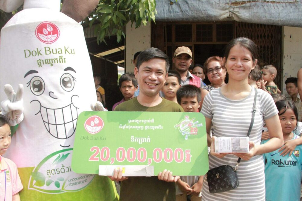 បុរសម្នាក់ឈ្មោះ ស្រេង គឹមហេង អាយុ 36ឆ្នាំ មុខរបរជាជាងផ្សារដែក រស់នៅភូមិទួលពង្រ សង្កាត់ចោមចៅ ខណ្ឌពោធិ៍សែនជ័យ រាជធានីភ្នំពេញ មានសំណាងបានឈ្នះរង្វាន់ធំនូវចំនួនទឹកប្រាក់ 20លានរៀលពីថ្នាំដុសធ្មេញ ដកបួឃូ ផ្កាឈូក2 ម្នាក់ទៀតហើយ។