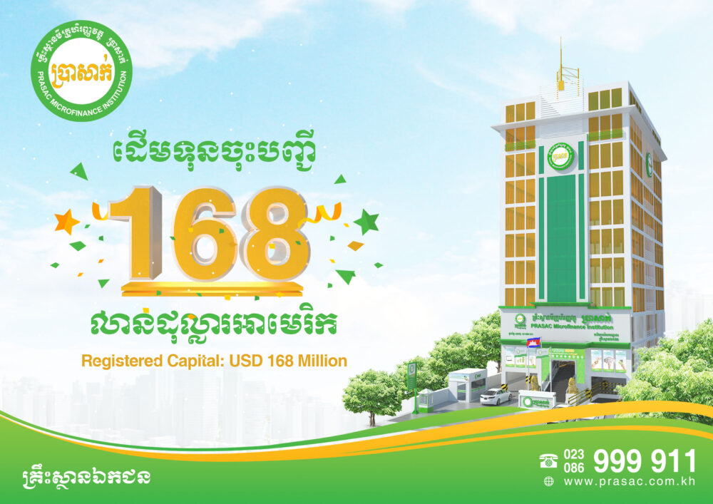 ភ្នំពេញ៖ ប្រាសាក់ ដែលជាគ្រឹះស្ថានហិរញ្ញវត្ថុលំដាប់ទី 1 ក្នុងវិស័យមីក្រូហិរញ្ញវត្ថុ និងជាស្ថាប័នមួយក្នុងចំណោមគ្រឹះស្ថានធនាគារធំៗទាំង 5 នៅកម្ពុជា បានបង្កើនដើមទុនចុះបញ្ជីពី 110លានដុល្លារអាមេរិក រហូតដល់ 168 លានដុល្លារអាមេរិក នាដើមឆ្នាំថ្មីនេះ។