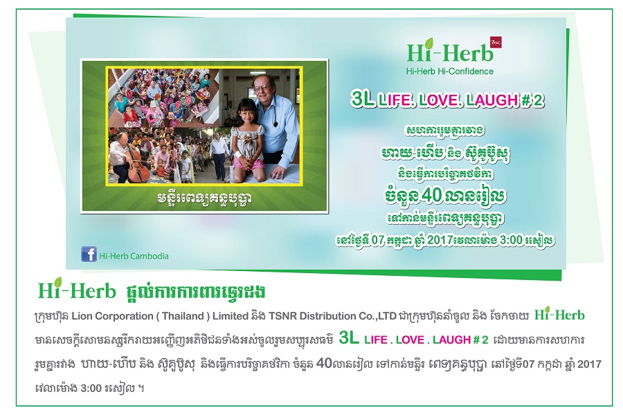 នាថ្ងៃទី 07 កក្កដាកន្លងទៅនេះ ក្រុមហ៊ុន Lion Corporation (Thailand) Limited និង TSNP Distribution Co., LTD ជាក្រុមហ៊ុននាំចូល និងចែកចាយផលិតផលម៉ាក Hi-Herb មានសេចក្ដីសោមនស្សរីករាយ ដោយបានអញ្ជើញអតិថិជនរបស់ខ្លួនចូលរួមកម្មវិធីមនុស្សធម៌ «3L LIFE. LOVE. LAUGH #2» ដោយមានការសហការរួមគ្នារវាង ហាយ-ហើប និងស៊ូគូប៊ូសុ ដោយបាននាំយកថវិកា ៤០លានរៀលជូនដល់មន្ទីរពេទ្យគន្ធបុប្ផា៕