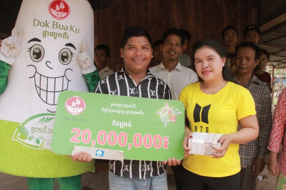 ភ្នំពេញ ៖ ស្ត្រីម្នាក់មានឈ្មោះ ហ៊ិន ស្រីលាក់ អាយុ៣១ឆ្នាំ បច្ចុប្បន្នជាប្រជាពលរដ្ឋរស់នៅភូមិនៀល ឃុំត្រាំកក់ ស្រុកត្រាំកក់ ខេត្តតាកែវ មានសំណាងបានឈ្នះរង្វាន់ធំនូវចំនួនទឹកប្រាក់ ២០ លានរៀលពីថ្នាំដុសធ្មេញ ដកបួឃូ សញ្ញាផ្កាឈូក២ ។
