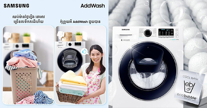 ប្រឡាក់តិចបោកតិច…ប្រឡាក់ច្រើនបោកច្រើន…ហើយបើទទឹកទឹកភ្លៀង ឬស្នាមខ្ទាតប្រឡាក់តាមផ្លូវពេល មេឃភ្លៀងត្រូវតែដាក់បោកភ្លាម…បើមិនអ៊ីចឹងទេ ដឹងតែមិនងាយបោកសម្អាតទេ!! ជាមួយនឹងម៉ាស៊ីនម៉ាស៊ីនបោកសម្លៀកបំពាក់ សាមសុង Add-Wash ម៉ូឌែលថ្មីនេះ បំពាក់នូវមុខងារថ្មីៗ ទំនើបទាន់សម័យ ត្រូវតាមគ្រប់តម្រូវការ…គ្រប់ស្ថានភាពរបស់លោកអ្នកដូចជា៖