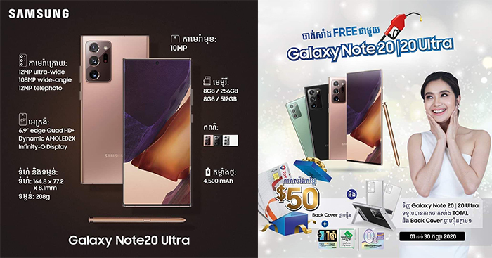 (ភ្នំពេញ) ថ្ងៃទី ០៤ ខែកញ្ញា ឆ្នាំ២០២០៖ កាន់តែពិសេស…!! រាល់ការទិញ Samsung Galaxy Note 20 ឬ Galaxy Note 20 Ultra ចាប់ពីថ្ងៃទី ០១ ខែកញ្ញា ឆ្នាំ២០២០ ដល់ថ្ងៃទី ៣០ ខែកញ្ញា ឆ្នាំ ២០២០ អតិថិជនទាំងអស់នឹងទទួលបានការថែមជូនគូប៉ុងចាក់ប្រេងឥន្ធៈតម្លៃ ៥០ ដុល្លារ ភ្លាម…!!