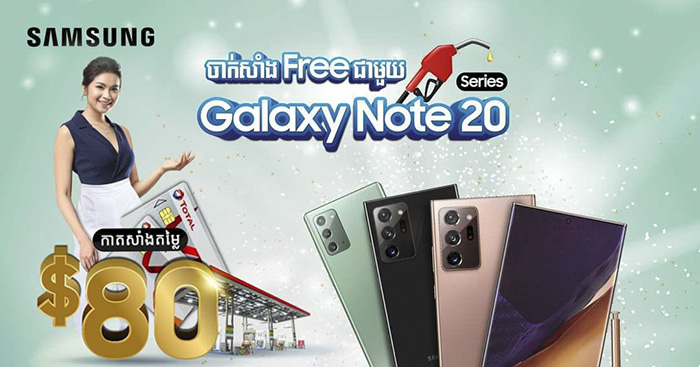 (ភ្នំពេញ) ថ្ងៃទី ១៩ ខែតុលា ឆ្នាំ ២០២០៖ តោះៗ…មកឱ្យលឿន…! លើកនេះក្រុមហ៊ុន សាមសុង ផ្តល់ជូនប្រូម៉ូសិនថែមជូនកប់សាហាវណាស់…ធានាថាម៉ាពេញចិត្តតែម្តង…!! រាល់ការជាវមហាអំណាចស្មាតហ្វូនប៊ិក Samsung Galaxy Note 20 ឬ Galaxy Note 20 Ultra ចាប់ពីថ្ងៃទី 15 តុលា រហូតដល់ ថ្ងៃទី 15 ខែវិច្ឆិកា ឆ្នាំ 2020 អតិថិជនទាំងអស់នឹងទទួលបានកាតចាក់សាំងតម្លៃ $80 នៅ TOTAL ជាមួយនឹងប្រូម៉ូសិនថែមជូនយ៉ាងច្រើនសន្ធឹកសន្ធាប់ទៀត…!!