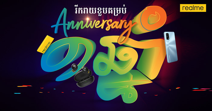 ថ្ងៃទី27 ខែតុលា ឆ្នាំ2020 គឺជាថ្ងៃខួបគម្រប់១ឆ្នាំរបស់ realme ដែលជាម៉ាកដែលផ្តោតទៅលើ កម្លាំងម៉ាស៊ីនខ្លាំង រចនាបទទាន់សម័យ និងការហ៊ានឆ្ពោះទៅមុខ នៅក្នុងទីផ្សារកម្ពុជា។ ហើយក្នុងនាមជាម៉ាកបច្ចេកវិទ្យាដ៏ពេញនិយម ដែលមានអាយុកាលវ័យក្មេងមួយ ដែលមានស្មារតី “ហ៊ានឆ្ពោះទៅមុខ” យកចិត្តទុកដាក់លើការធ្វើឱ្យប្រសើរឡើងផលិតផល ផ្តល់ជូនអ្នកប្រើប្រាស់នៅក្នុងឧស្សាហកម្មនេះនូវចម្លើយដ៏ពេញចិត្ត។ ទន្ទឹមនឹងនេះ ដើម្បីចូលរួមអបអរសាទរខួប ១ ឆ្នាំនៃការចូលមកទីផ្សារកម្ពុជា realme ក៏មានប្រូម៉ូសិនពិសេសដើម្បីតបស្នងការស្រលាញ់និងការគាំទ្រពីអ្នកប្រើប្រាស់។