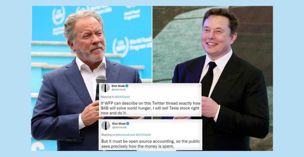 ទាក់ទងនឹងបញ្ហាខ្វះថវិកាទិញស្បៀងអាហារជួយដល់ប្រជាជនកំពុងជួបគ្រោះអត់ឃ្លា មហាសេដ្ឋីជនជាតិអាម៉េរិក ដើម្បីកំណើតអាហ្វ្រិកខាងត្បូង និយាយថា «បរិច្ចាគ 6 ពាន់លានដុល្លារដើម្បីសង្គ្រោះពិភពលោកក៏បាន» ប៉ុន្តែ លោក Elon Musk ចង់ឱ្យប្រធានស្ថាប័នមួយរបស់អង្គការសហប្រជាជាតិ «បង្ហាញតម្លៃភាពថវិកា» ឱ្យបានច្បាស់លាស់។
